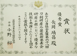 長岡靖昌氏が公益財団法人、日本美術刀剣保存協会 第68回刀剣研磨外装技術発表会研磨の部にて表彰されました。