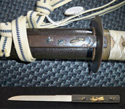拵(こしらえ)の裏側に挿す小刀。紙切りや紐切りなど日常生活用の刃物として使用されました。したがって手裏剣のように投げつける武器ではありません。持手の部分の装飾品です。